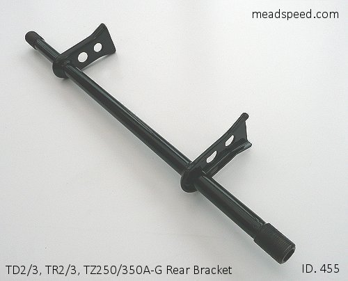 Yamaha TD2/3, TR2/3, TZ250/350A-G 1965-1980 Rear Fairing Bracket finished in Black original Pt. No. 240-28358-00, 3G2-28357-00. with threaded ends to fit Fairing damper mounts, which is our ID 448. Chrome fairing screws are ID 459.