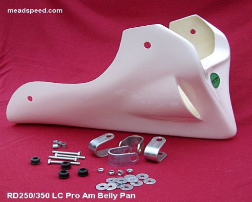 Yamaha RD250/350LC 1980-83 Pro Am Belly Pan. A replica of the original. Supplied with all fittings, Stainless Steel mountings with a Rubber Frame protector, No drilling required. Available in Black or White. Decals are not included but see our item 671 for details. Pro Am Fairing is our ID 655.