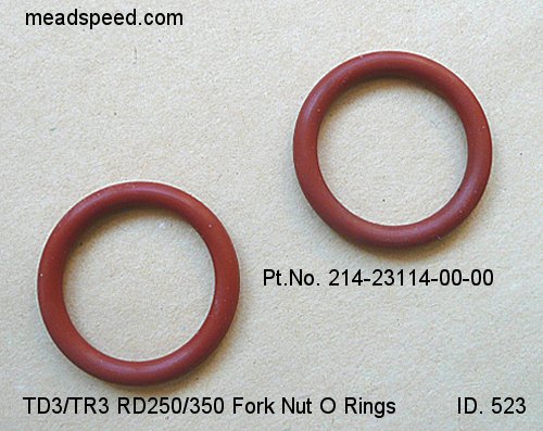 Yamaha TD3/TR3 / TZ250/350C-E / TZ750A-F Fork Nut O Rings Pt. No. 214-23114-00-00 replacement of the originals. Sold as a Pair (2) Fitted to RD250/350A-B, DT250/360/400, YZ100/125/250/360,TX500/650/750, and many others. Check Part Number for your model. We also have TD/TR2-TZ250/350C-D-E O rings.