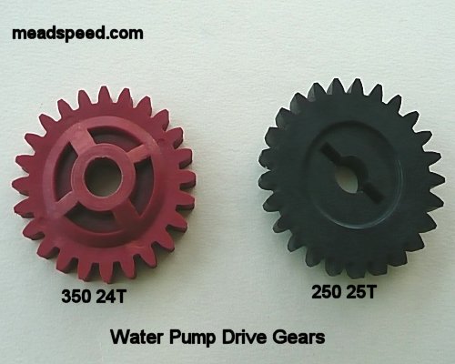 Yamaha TZ250/350A-G 1973-1980 water pump gears, replicas of the originals. TZ250 Primary gear (77T) / 25 tooth, Pt. No. 329-13178-00. TZ350 Primary gear (74T) / 24 tooth. Pt. No. 328-13178-00.