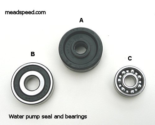 Yamaha TZ250/350A-G 1973-1980, TZ700/750A-F 1975-1979 Water Pump Seal (A) Pt.No. 93103-10168 £21.50. Inner bearing (B) Pt.No.93306-20005 £9.95, Outer bearing (C). Pt.No. 93300-60801 £15.55. The Seal also fits the TZ125G-H. All Items are available as separate items and priced individually.