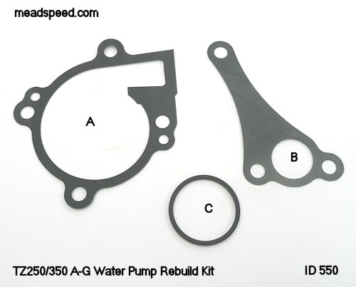 Yamaha TZ250/350A-G 1973-1980 Water Pump Gasket Kit, With Inner and Outer Gaskets, and O Ring for the cap housing. Inner Gasket. (A) Pt. No. 383-12428-00, Outer Gasket. (B) Pt. No. 383-12427-00, Cap housing O ring. (C) Pt. No. 93210-27105. It is Recommended that the O Ring is changed with the Gaskets. We also stock Water Pump Bearings & Seals.
